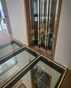 The client’s vision for the project extended beyond just the elevator itself. It included glass landings with custom lighting on both the main and upper levels. These elements create a striking “see-through” effect, transforming the elevator into a stunning architectural centerpiece that seamlessly integrates with the home’s contemporary design.