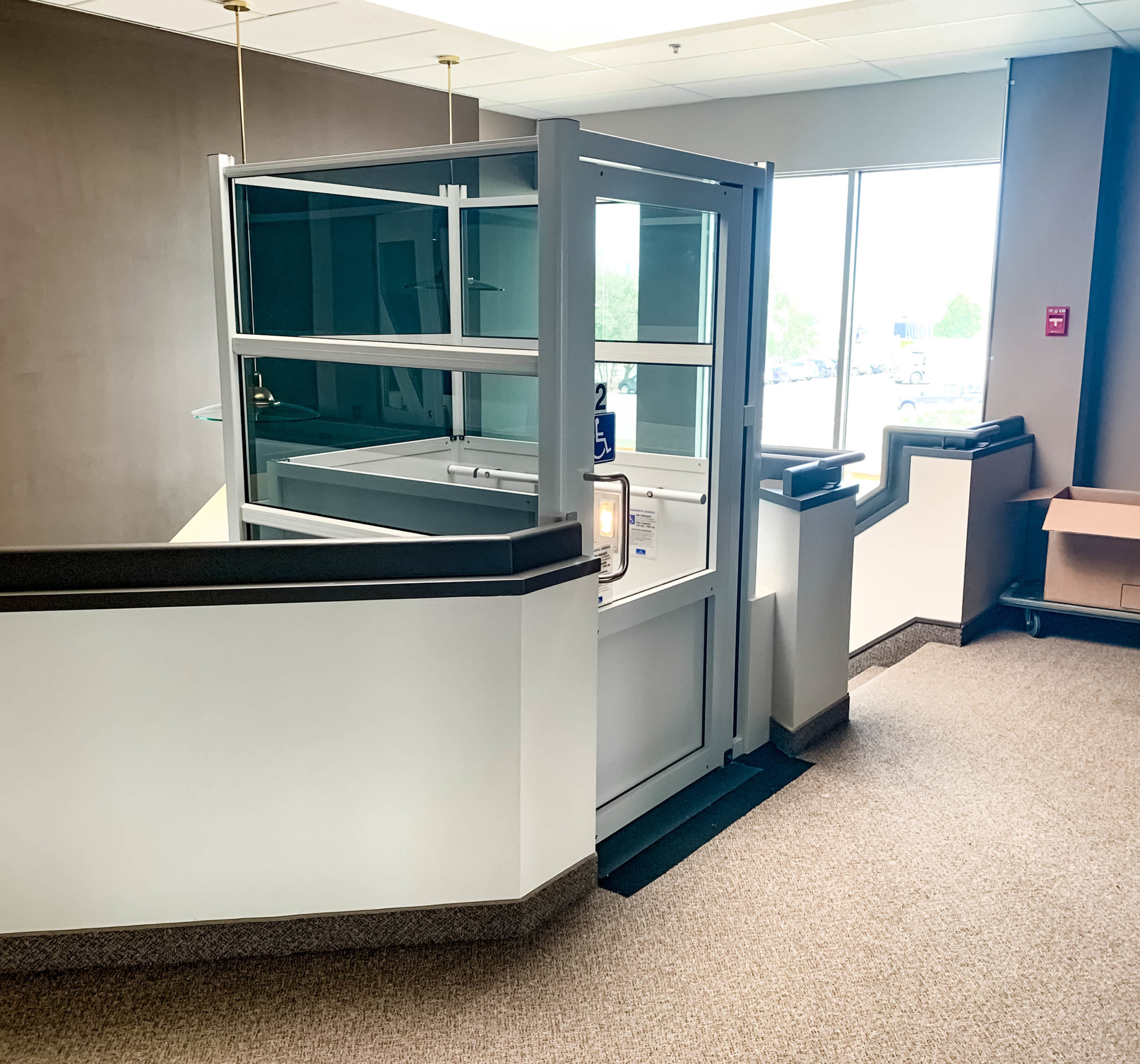 Our dealer Access Store won project of the month July by installing a Genesis Enclosure at the Palliser Factory Outlet offices in Winnipeg, Canada – Congratulations! The vertical platform lift fits perfectly into the existing staircase and allows wheelchair users or people with limited mobility to easily access the upper floor.
