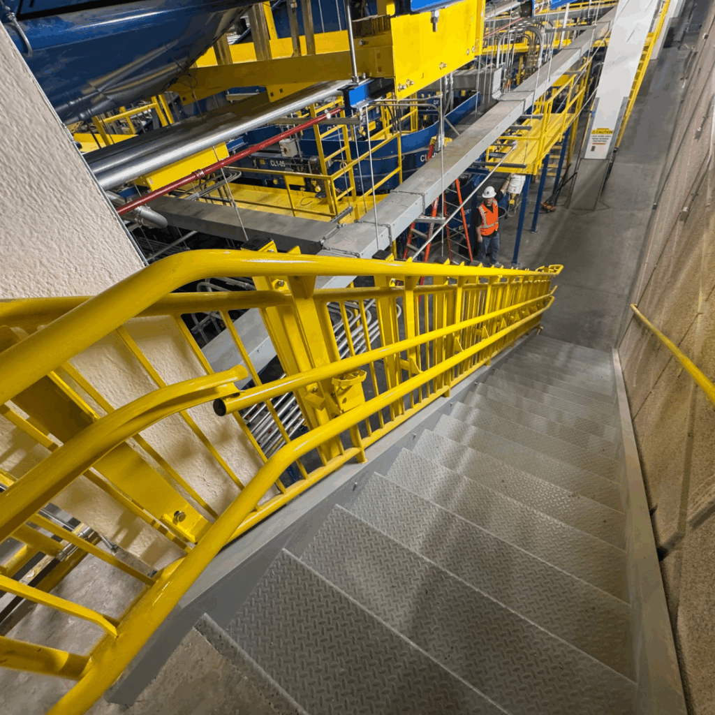 That turning point led to the selection of the Garaventa Lift Artira Inclined Platform Lift, a system specifically designed to travel along an existing stairway rather than occupying its own enclosed space. Because the Artira doesn’t require major structural changes, it offered a pathway that respected the layout of the conveyors, the emergency access routes, and the building’s operational flow. Instead of reshaping the space to fit the mobility equipment, the team found a product that fit the space exactly as it was.