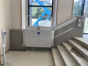 The Garaventa Lift branch in British Columbia, Canada installed an Xpress II in a new residential building in Richmond, BC, Canada. The lift was installed in the new color Silver Moon and with a side load which offers easier access. The platform lift travels on two rails which are secured directly to the wall and can be folded when it isn’t used. It was the ideal solution to provide access between the two landings.